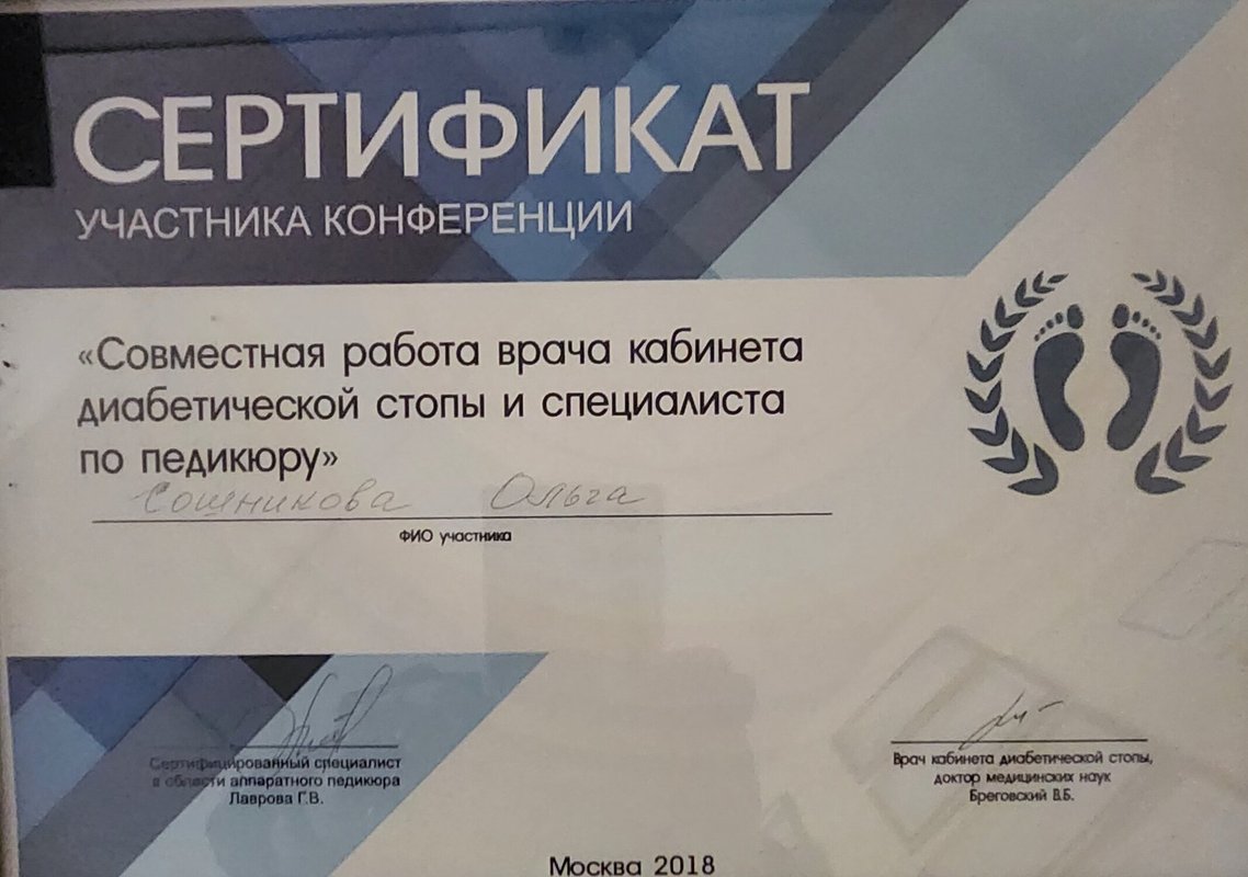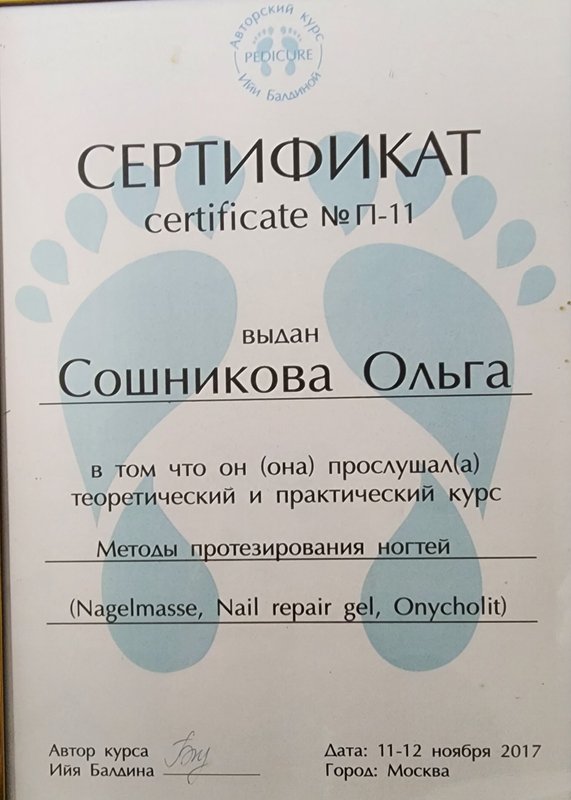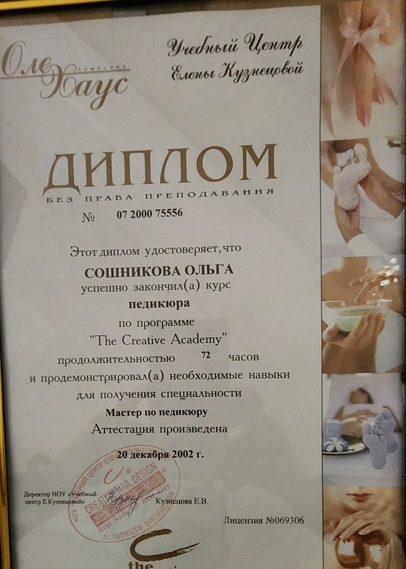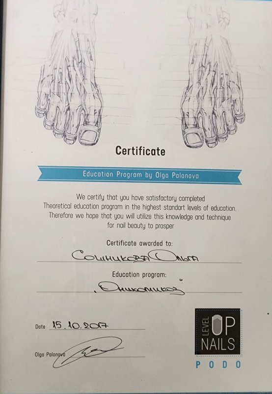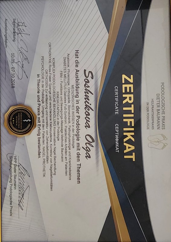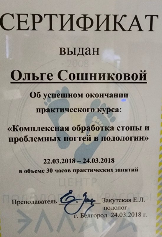Дипломированный специалист по работе со здоровыми и сложными стопами/ногтями. Сертифицированный мастер подолог.