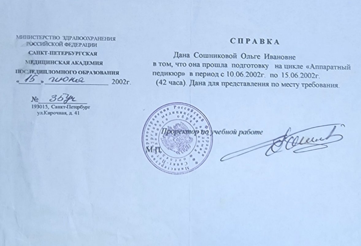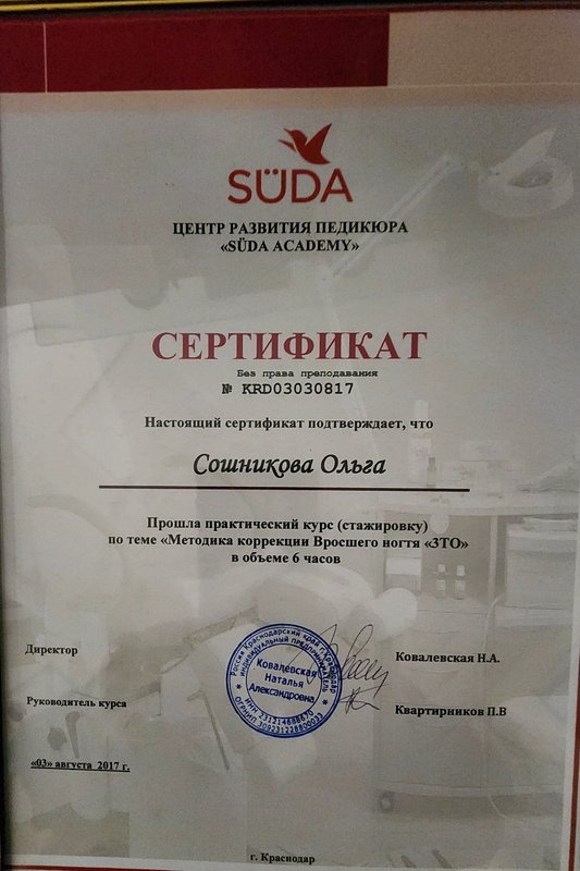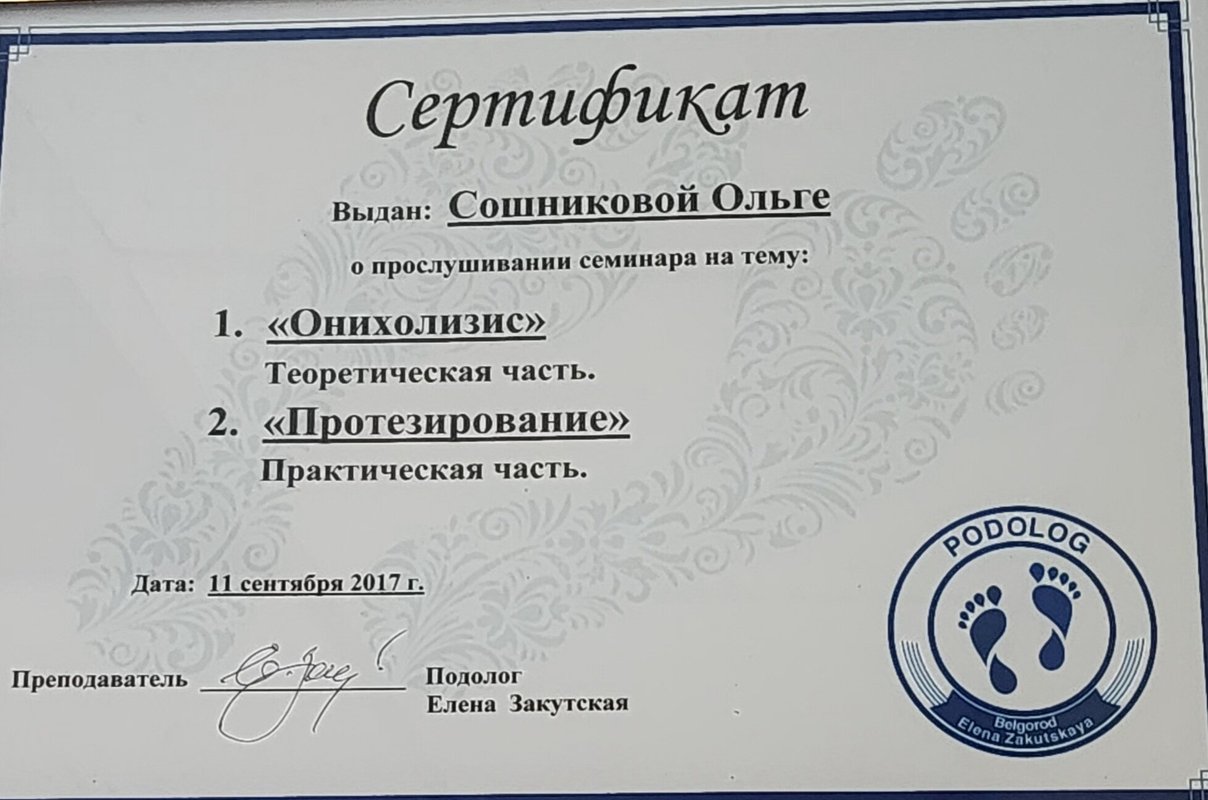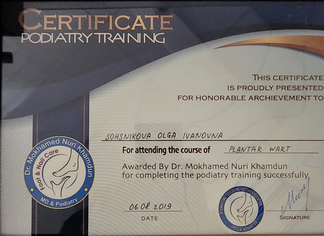 Дипломированный специалист по работе со здоровыми и сложными стопами/ногтями. Сертифицированный мастер подолог.