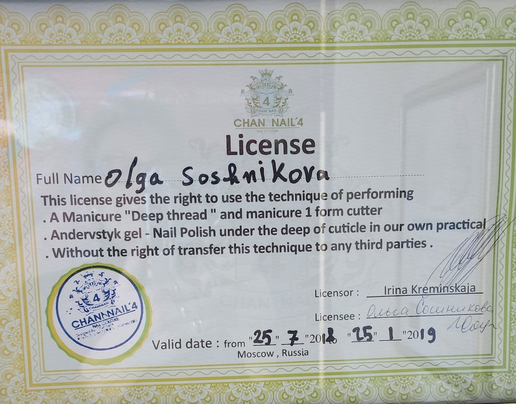 Ольга Сошникова - квалифицированный мастер! Она всё показала, рассказала и объяснила. Мой ноготь нужно было обработать, и Ольга выполнила работу так, что я практически ничего не заметила. Процедура прошла почти без боли, в отличие от того, как это делал специалист из другого салона. Инструменты мастера были чистыми и запечатанными. Также отмечу прекрасную атмосферу в помещении и хорошего администратора.