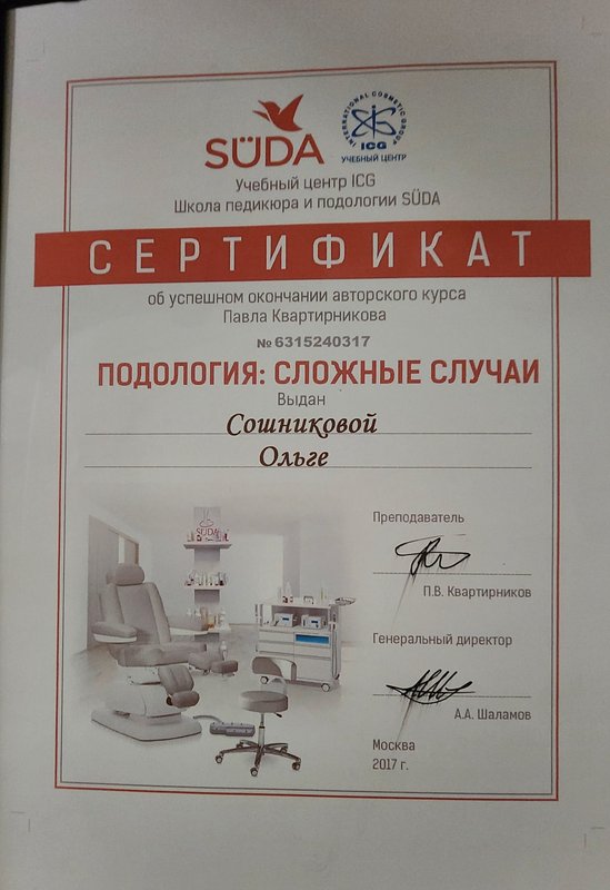 Всё прошло отлично, я очень благодарна мастеру. Понравился её высокий профессионализм и вежливость. Это настоящая медицинская услуга, а не просто косметическая процедура. Я пришла с проблемой, и она была решена. Внутри клиники очень чисто, оборудование современное, всё сделано на высшем уровне. Я уже порекомендовала своим приятельницам не просто идти на обычный педикюр в другое место, а обращаться именно к Ольге Сошниковой. Эта процедура особенно важна для пожилых людей с проблемными ногами.
