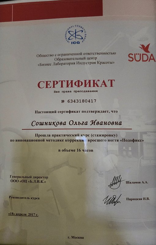 Результат мне понравился, вылечили то, что болело, было образование. После дали рекомендации по гигиене, мазать лекарством. От подолога Ольги Сошниковой остались хорошие впечатления, она профессионал.